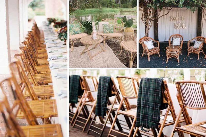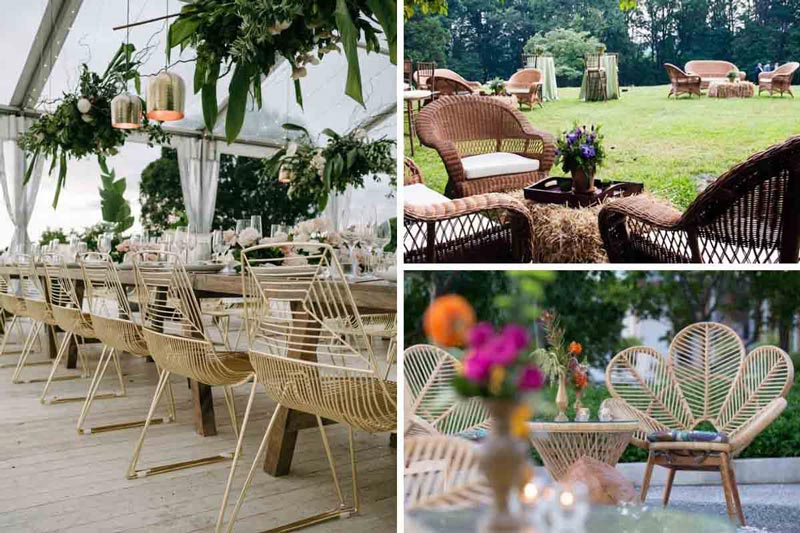 Les chaises en rotin plongeront immédiatement vos convives dans l’ambiance bohème que vous souhaitez installer. Confortables et légères, les chaises en rotin sont peu encombrantes et faciles à installer. Petite astuce : pourquoi ne pas créer un coin cocooning avec des chaises et une table basse en rotin ? Vos invités en pleine conversation pourront s’isoler un petit moment au calme et discuter avec ceux qu’ils n’ont pas vus depuis longtemps, ou avec les nouveaux amis qu’ils se sont faits lors de votre soirée de réception. Vous pouvez trouver une multitude de modèles de chaises en rotin pas cher, ou choisir des chaises en rotin en location le temps d’une soirée.